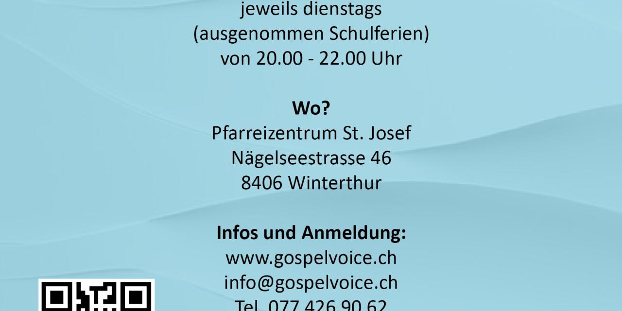 Gospel Voice Winterthur probt jeweils Dienstags von 20.00-22.00 Uhr im Pfarreizentrum, Nägelseestrasse 46, Winterthur-Töss (ausgenommen in den Schulferien). Interessierte sind herzlich zu Schnupperbesuchen an eine unserer Proben eingeladen. Eine kurze Anmeldung an unsere Präsidentin unter info@gospelvoice.ch genügt! Lassen Sie sich vom Gospel-Virus anstecken! Wir freuen uns über Ihr Interesse.